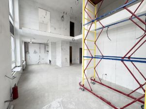 Планировка квартиры имеет второй свет. На первом уровне кухня-гостиная 35 кв.м., санузел, гардеробная. На втором уровне, две комнаты, санузел, выходящий на второй свет внутри квартиры. Выполнена стяжка пола на первом уровне, теплые полы, выровнены и оштукатурены стены, шумоизоляция, разведено электричество по квартире. Под чистовую отделку. Площадь указана на два уровня по дизайн-проекту. Несколько фотографий в фотогалерее с отделкой взяты из проекта.