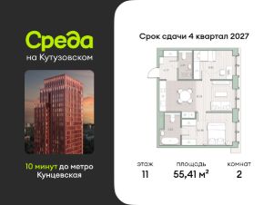 Продаётся двухкомнатная квартира общей площадью 55.41 кв. м. с отделкой на выбор: черновая, White Box. Квартира на 11 этаже корпуса 4.2 в жилом комплексе бизнес-класса "Среда на Кутузовском". До метро "Кунцевская" 10 минут пешком.