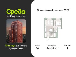 Продаётся однокомнатная квартира общей площадью 34.48 кв. м. с отделкой на выбор: черновая, White Box. Квартира на 16 этаже корпуса 5 в жилом комплексе бизнес-класса "Среда на Кутузовском". До метро "Кунцевская" 10 минут пешком.