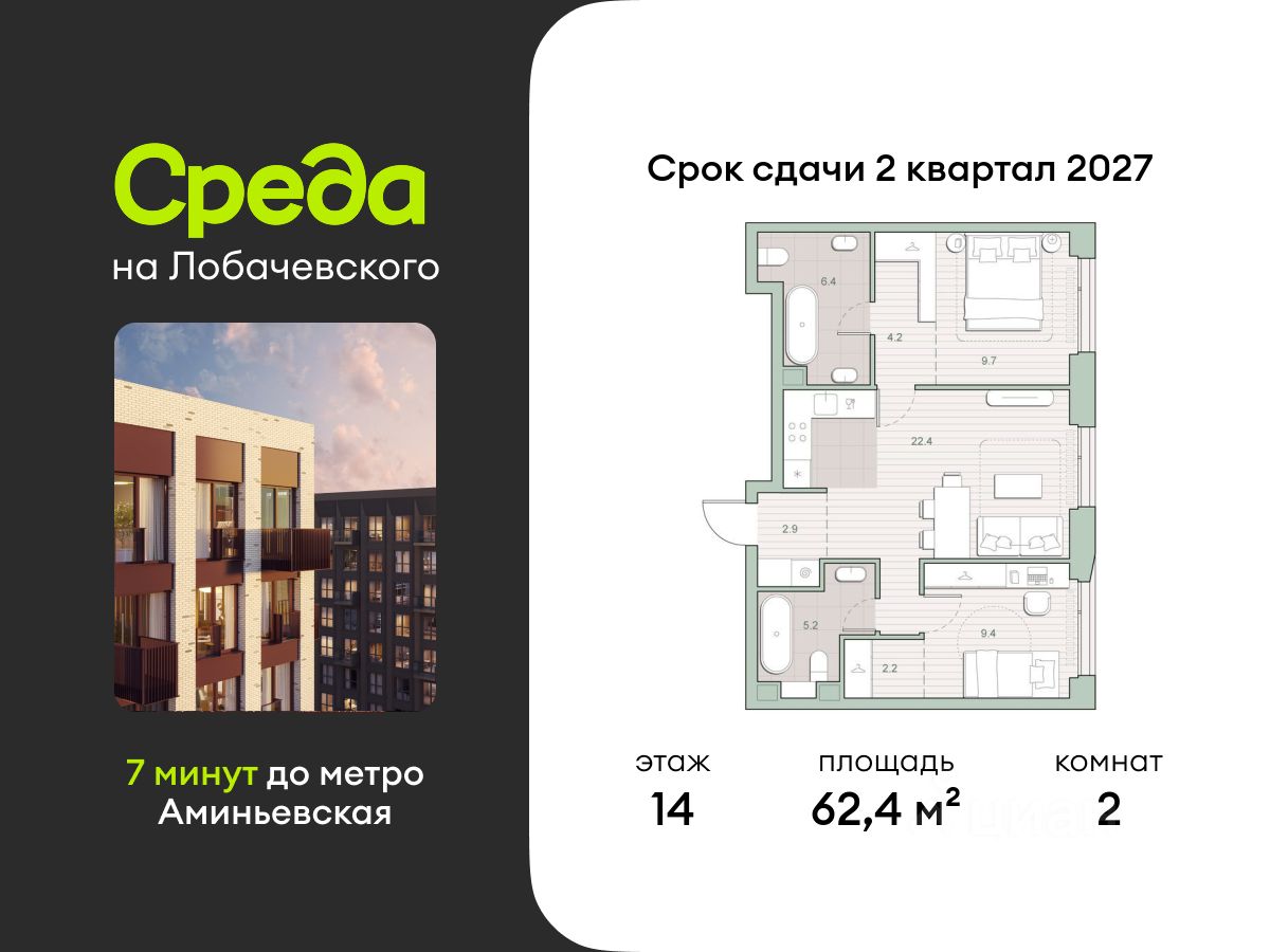 Продаётся двухкомнатная квартира общей площадью 62.40 кв. м. с отделкой на выбор: черновая, White Box. Квартира на 14 этаже корпуса 5.4 в жилом комплексе бизнес-класса "Среда на Лобачевского". До метро "Аминьевская" 7 минут пешком.
