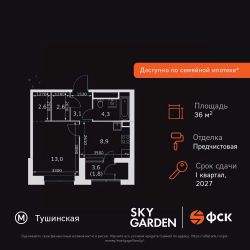 Продаётся 1-к квартира номер 313 общей площадью 36.3 кв.м. на 26-м этаже 31 этажного здания. Предчистовая отделка. Цена с учётом скидки.