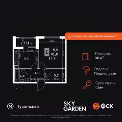 Продаётся 1-к квартира номер 144 общей площадью 38.8 кв.м. на 22-м этаже 43 этажного здания. Предчистовая отделка. Цена с учётом скидки.