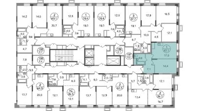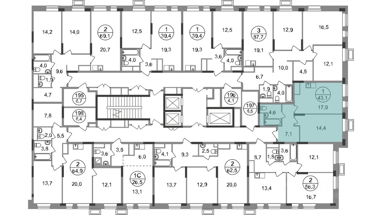Общая площадь квартиры - 43,1 кв. м, этаж 3 из 19.