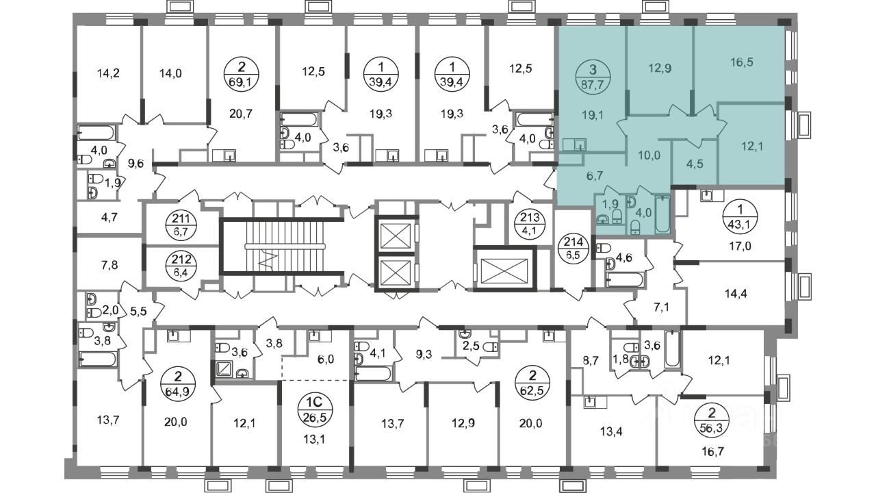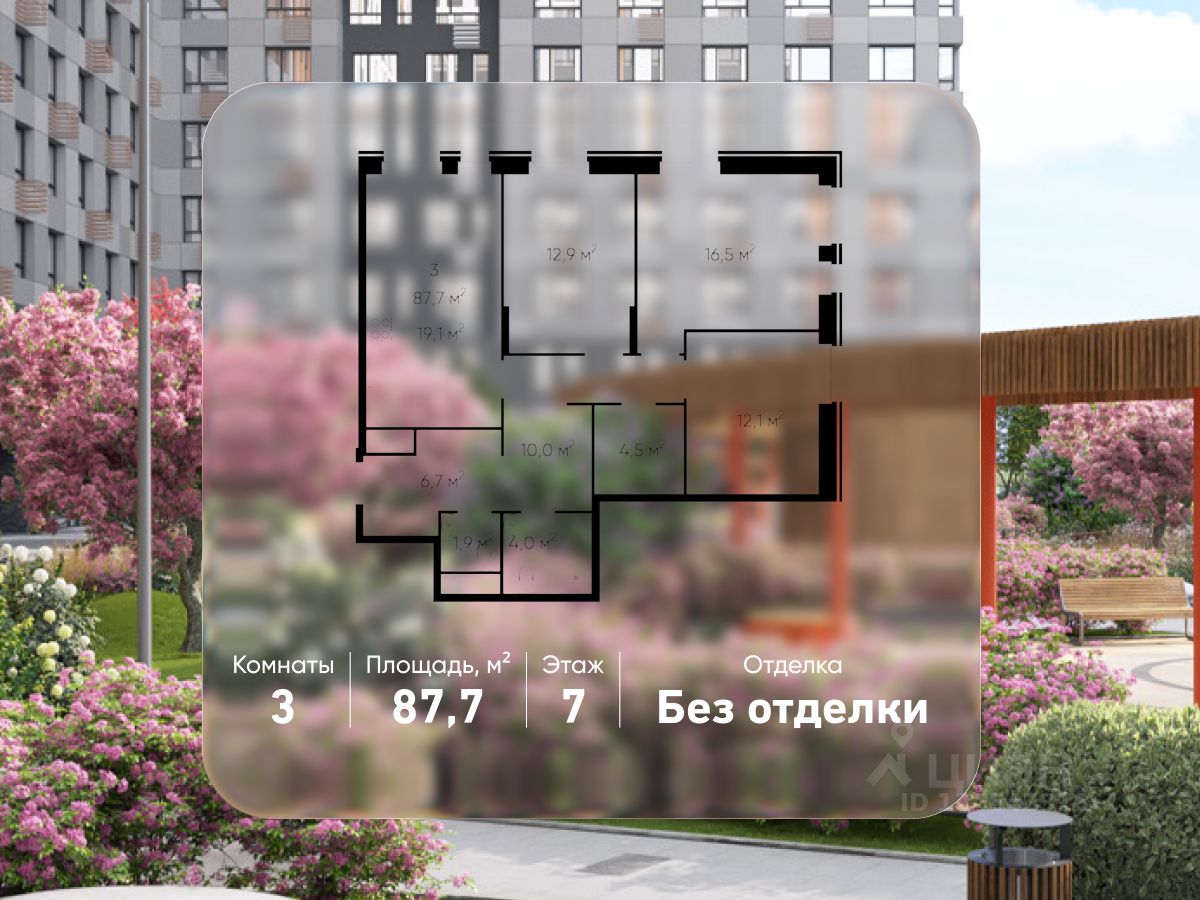 Общая площадь квартиры - 87,7 кв. м, этаж 7 из 19.