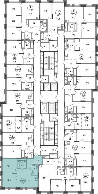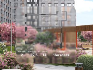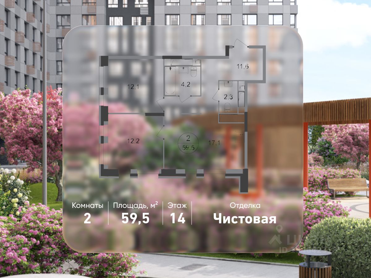 Общая площадь квартиры - 59,5 кв. м, этаж 14 из 20.