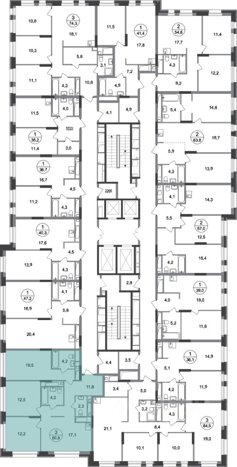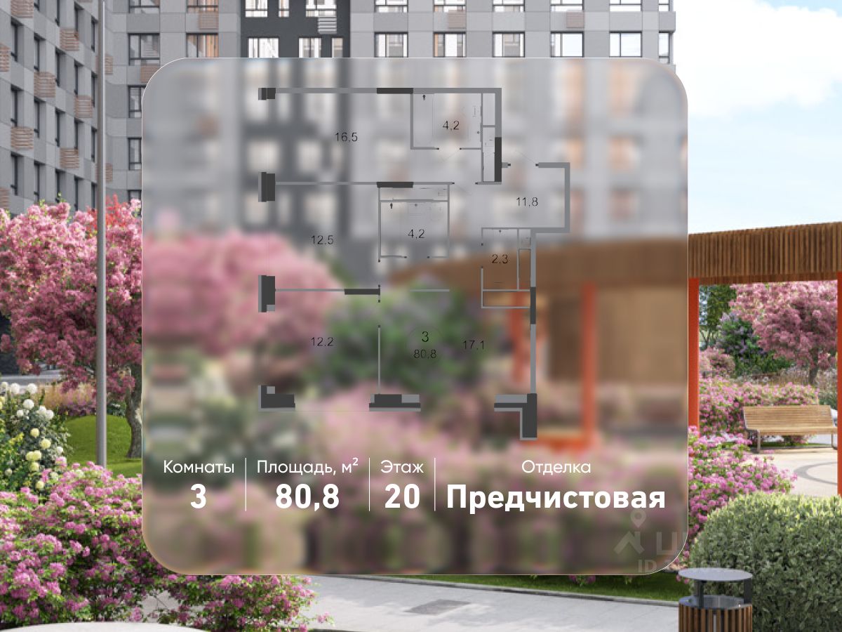 Общая площадь квартиры - 80,8 кв. м, этаж 20 из 20.