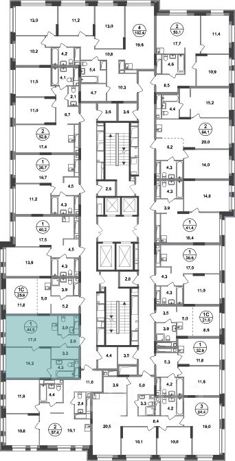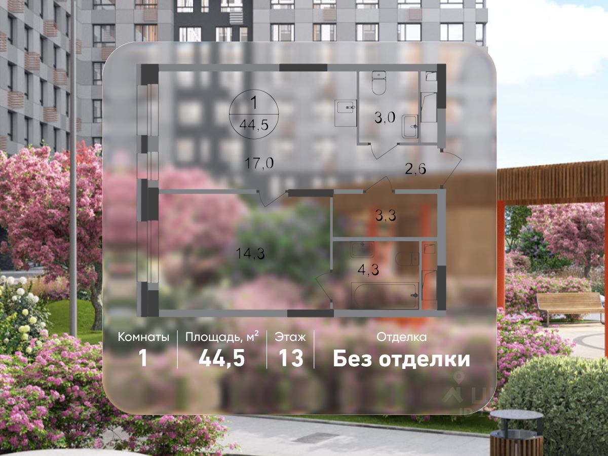 Общая площадь квартиры - 44,5 кв. м, этаж 13 из 20.