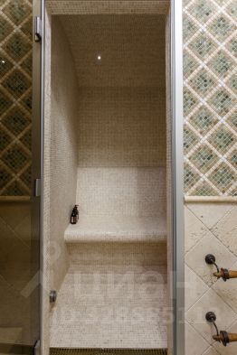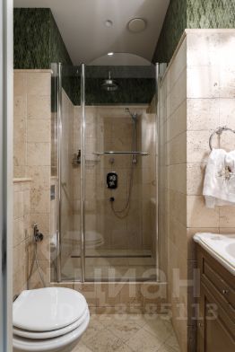 - Санузлы отделаны натуральным камнем `Anticati Travertino Noce` и мраморной мозаикой `Boticino Anticato`;