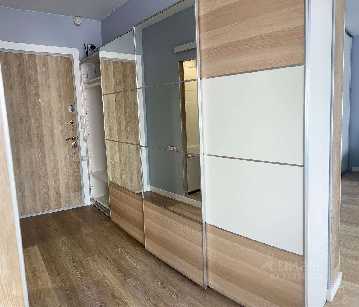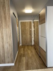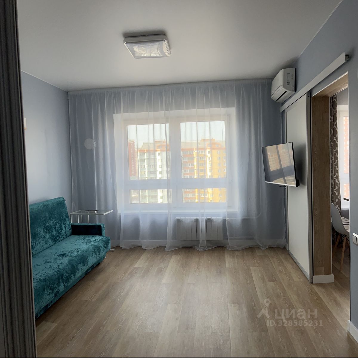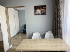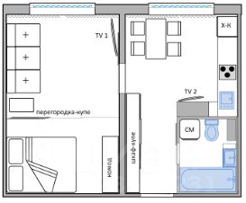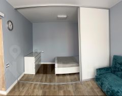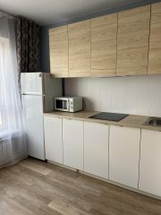 Кухня 10м2, комната 19м2, разделена межкомнатной раздвижной перегородкой-купе с двухспальной кроватью в спальне и диваном в зоне гостиной. Вся мебель новая.