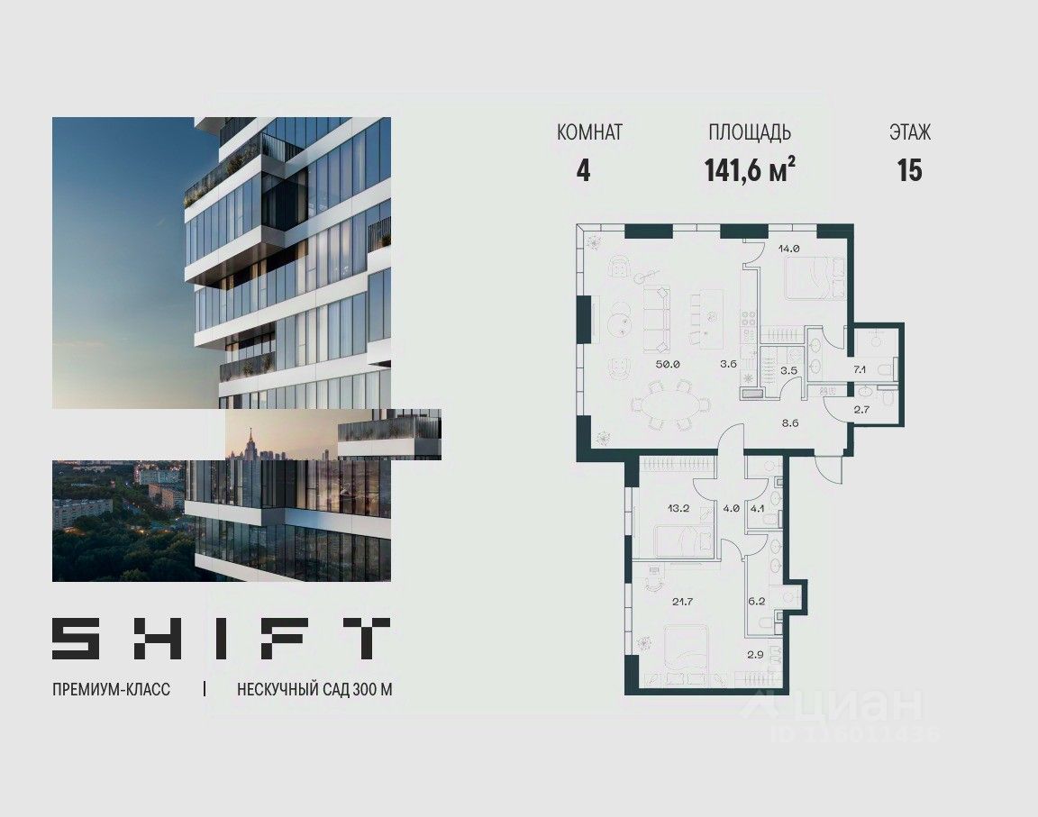 4-к квартира в премиальном комплексе SHIFT на 15-м этаже в 18 этажном здании. Общая площадь 141.6 кв. м.