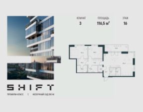 3-к квартира в премиальном комплексе SHIFT на 16-м этаже в 18 этажном здании. Общая площадь 116.5 кв. м.