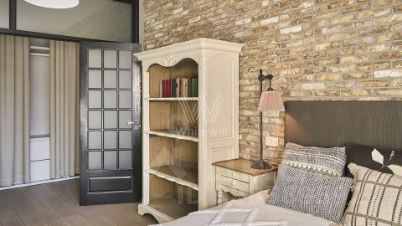 Интерьер выполнен в выразительном европейском стиле с акцентом на натуральные материалы, премиальную мебель и тщательно подобранные детали. В отделке использованы французская дубовая доска Шен де Лест (Chne de l'Est), а также голландская кирпичная плитка ручной формовки. Особое внимание привлекают английский керамогранит, американские стеллажи из восстановленной древесины от железнодорожных шпал, а также персидский ковер, создающий завершённый и благородный образ интерьера.