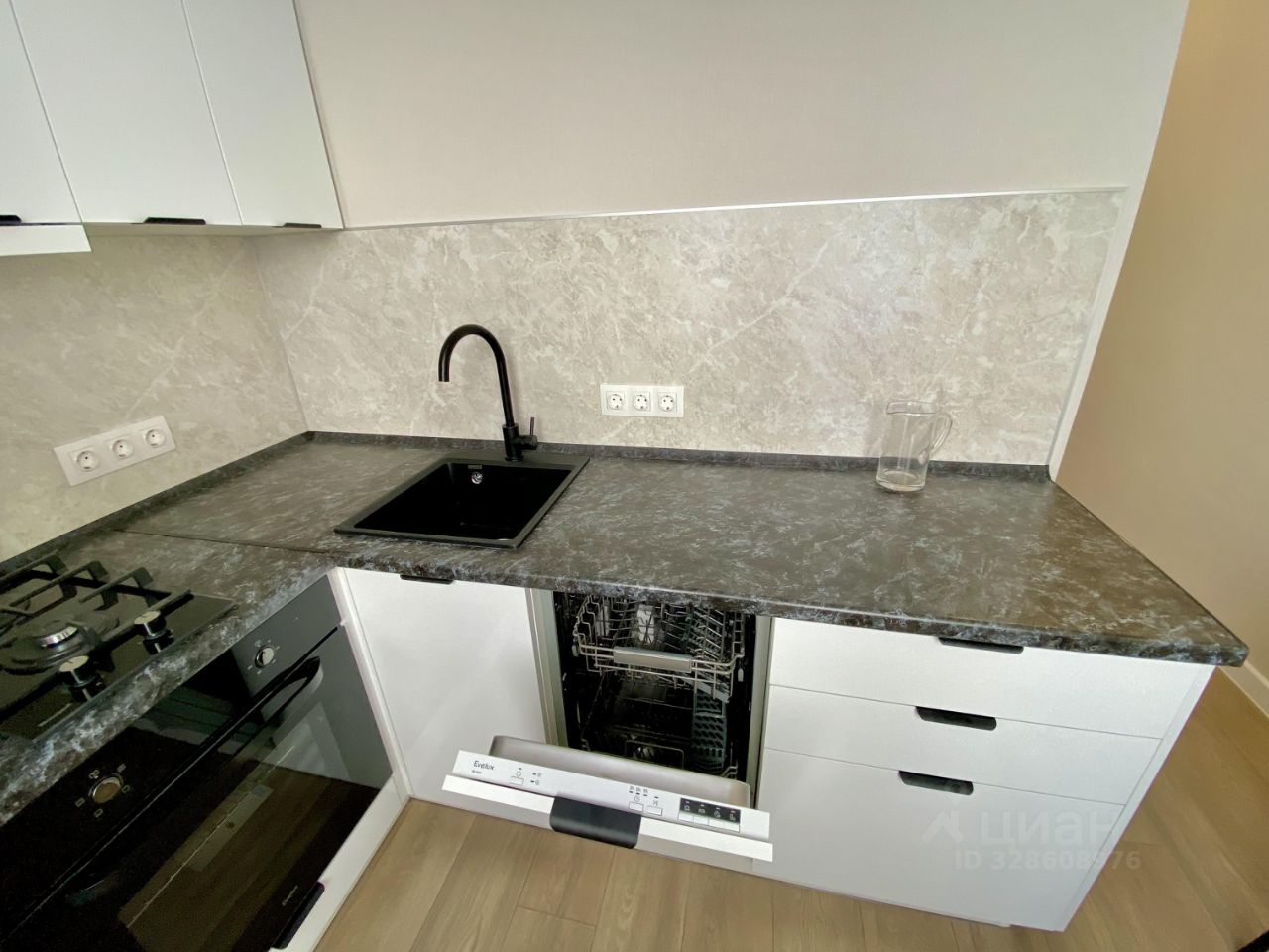 - кухонный гарнитур с посудомоечной машиной, газовой панелью, электродуховым шкафом и встроенной вытяжкой, холодильником;
