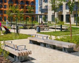 Все корпуса в квартале гармонично сочетаются, образуя единую городскую среду. Между собой их объединяет невысокая этажность и натуральная цветовая гамма. Здесь приятно гулять и проводить время на улице всей семьёй.