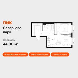 Продаётся 1-комн. квартира площадью 44 кв.м на 12 этаже 23 этажного дома (Корпус 69.1, Секция 1) проекта ПИК Саларьево парк. Светлый просторный подъезд на уровне земли, функциональная планировка, большие окна, предчистовая отделка.