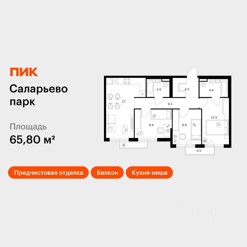 Продаётся 3-комн. квартира площадью 65,8 кв.м на 9 этаже 15 этажного дома (Корпус 57.2, Секция 2) проекта ПИК Саларьево парк. Светлый просторный подъезд на уровне земли, функциональная планировка, большие окна, предчистовая отделка.