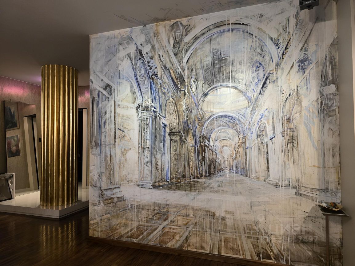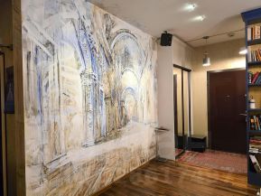 100 метровая гостиная интегрированная с кухней, создает ощущение уютного загородного дома. На одной из стен большая фреска работы Валерия Кошлякова.