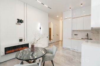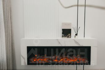 В гостиной - электрокамин. Кухня - с каменной столешницей. В спальне на полу - инженерная доска Lab Arte.