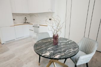 - полностью оборудованная кухня (посудомойка, индукционная варочная поверхность, фильтр для воды и т д) белая с бронзой (не золото, фото искажает немного)