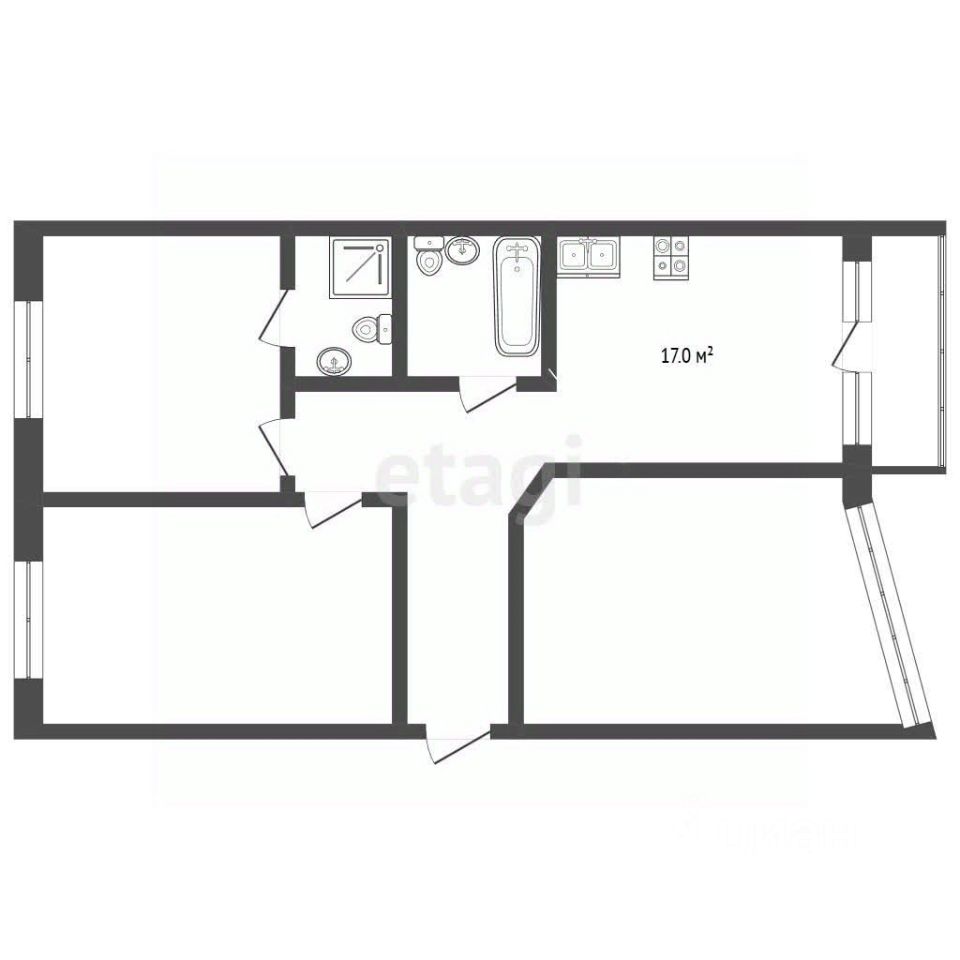 Эргономичная планировка: просторная кухня и 3 комнаты, включая мастер-спальню.