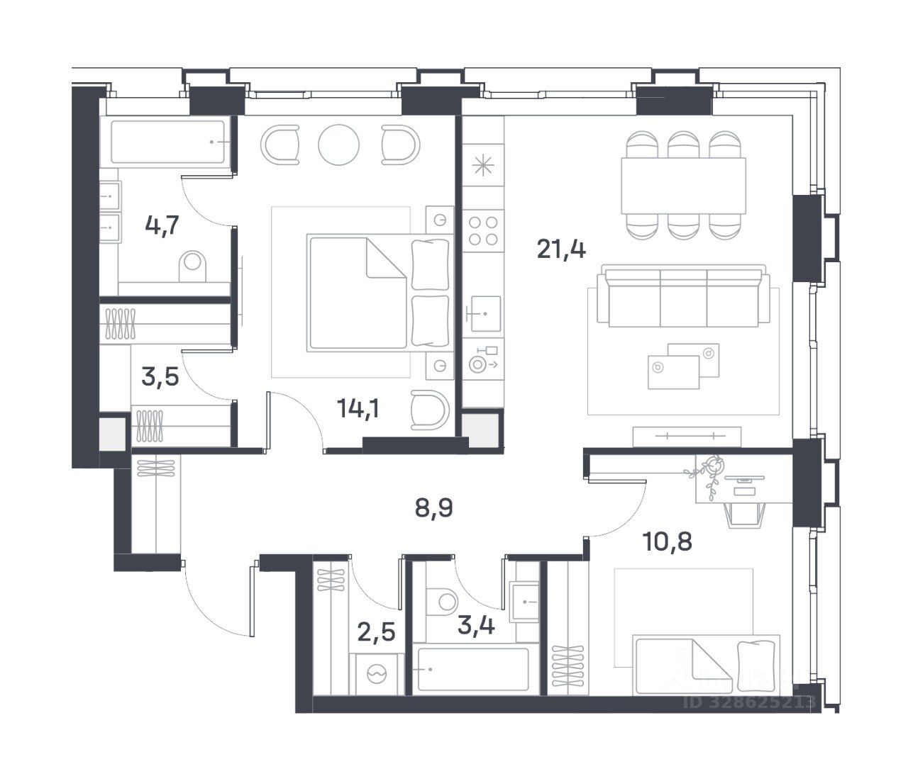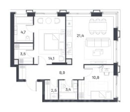 Кухня-гостиная (21,4 м²) — огромное светлое пространство для приема гостей и семейных вечеров.