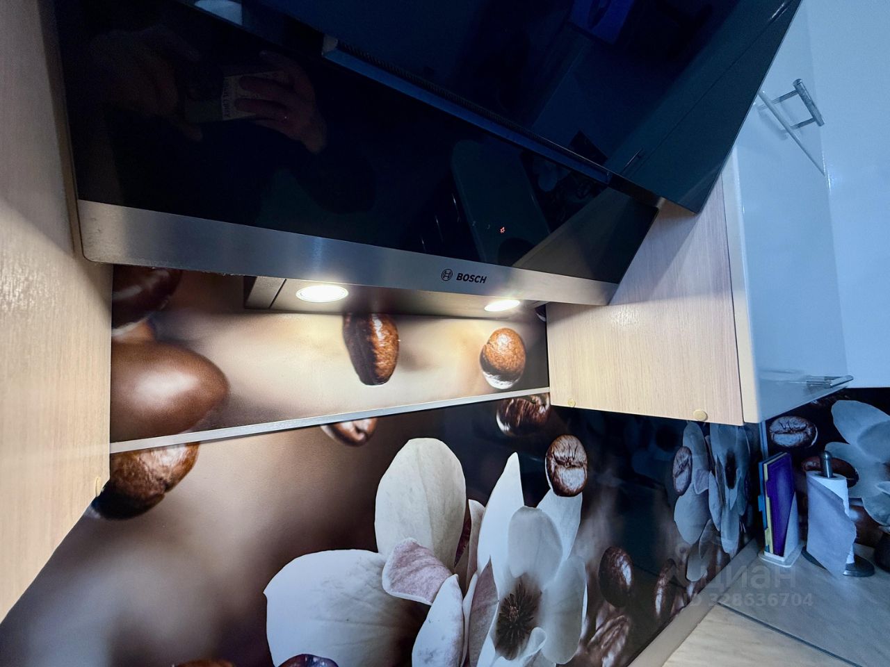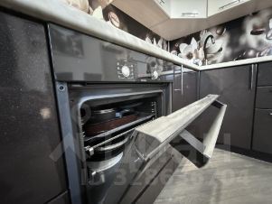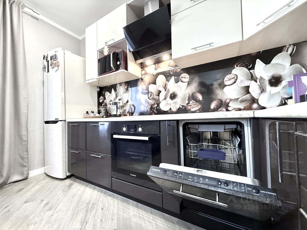 на кухне: кондиционер, кухонный гарнитур со встроенной вытяжкой, духовым шкафом, варочной панелью, посудомоечной машиной, холодильник, диванчик удобный, телевизор, стол обеденный со стульями.