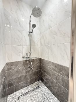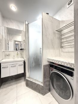 в ванной комнате установлен душ, и смонтирована душевая кабина, установлен шкаф, стол, зеркало с тумбой, стиральная машина, полотенцесушитель, принудительная вытяжка;