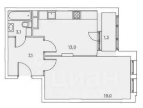 Общая площадь составляет 42.1 кв. метра (+ лоджия 3 кв метра, расположенная на кухне).
