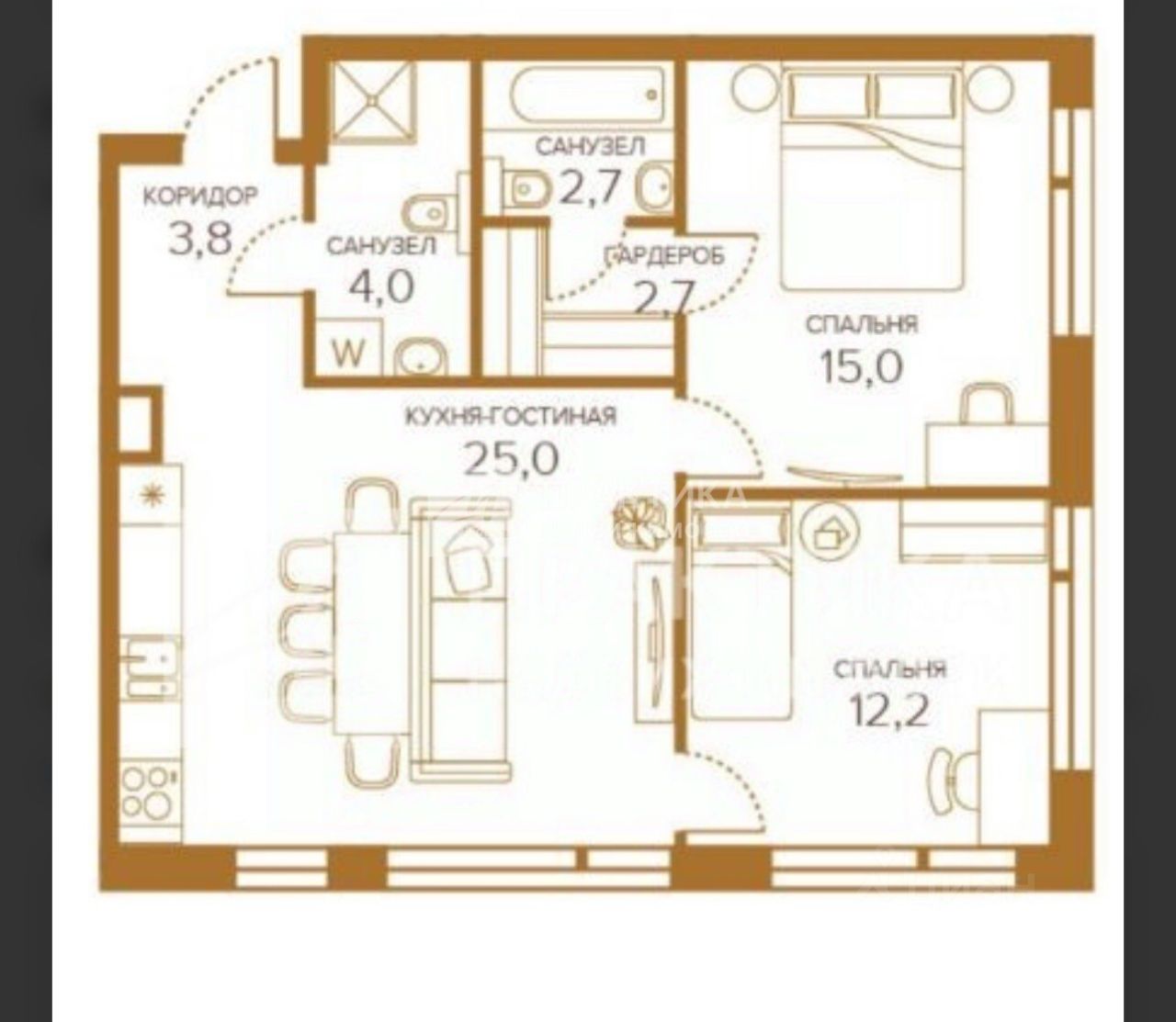 — Квартира с жилой площадью 27,2м2: мастер-спальня 15м2 с гардеробной - для ценителей функциональных решений, во второй комнате 12,2м2 два расширенных окна с видом во двор, которые добавляют пространства и уюта;