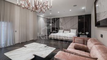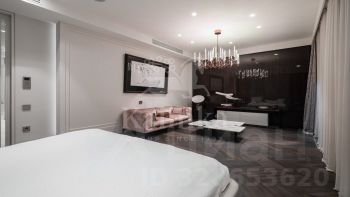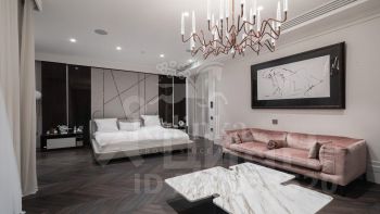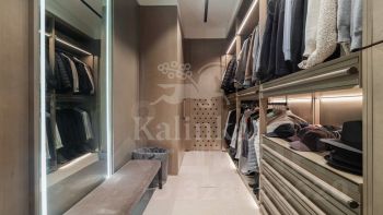Планировка: прихожая с большой гардеробной, просторная кухня-гостиная со столовой зоной и выходом на балкон, мастер-блок: спальня с выходом на балкон, две гардеробные, две ванные комнаты с хаммамом, кабинет; три спальни с ванными и гардеробным комнатами, отдельный блок с кухней и постирочной зоной, комната для персонала, гардеробная комната, гостевой санузел.