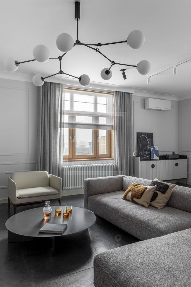 Интерьер - мягкая современная классика в приглушенной палитре: итальянская мебель, панели из шпона, встройка комбинированная (эмаль и шпон). Окна из массива лиственницы с металлическим обкладком. Фурнитура премиум-бренда AXOR.