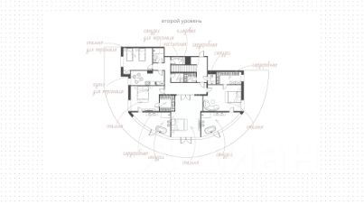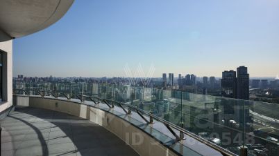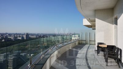 На первом уровне спланирована гостиная-столовая с каминной зоной, кухня, мастер-спальня с ванной комнатой, гардеробной и сейфовой комнатой, гостевой санузел, прихожая с гардеробной. Планировка второго уровня включает 3 спальни со своими санузлами, кабинет, спальню для персонала со своим санузлом, кухню для персонала. На обоих уровнях по всему периметру пентхауса обустроены просторные террасы площадью 100 м² каждая. С террас открывается захватывающий вид на Москву. Предусмотрено машино-место в подземном паркинге за дополнительную плату.