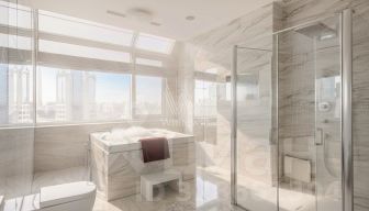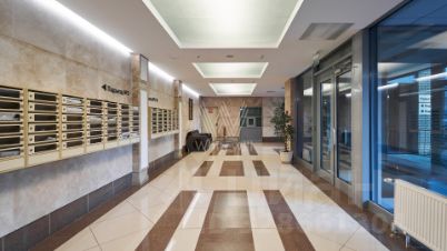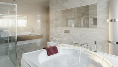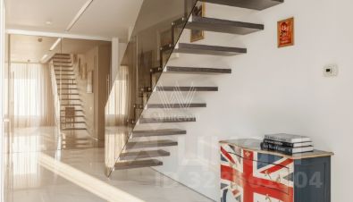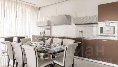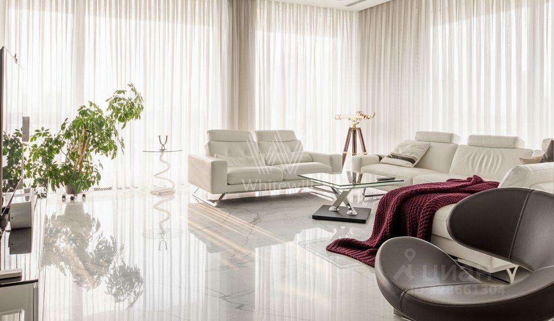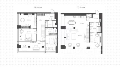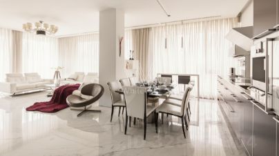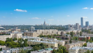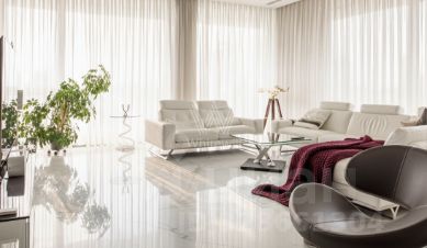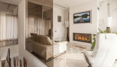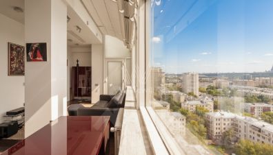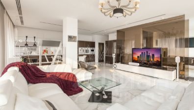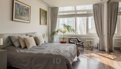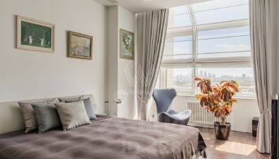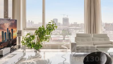 Видовой двухуровневый пентхаус в комплексе премиум-класса на Кутузовском проспекте напротив "Москва-Сити". Квартира площадью 220 м² с дровяным камином расположена на 14-15 этажах. Выполнен дизайнерский ремонт. Интерьер оформлен в белоснежных тонах. На полу выложена доска из натурального дерева и итальянский мрамор. В квартире много света за счёт высоких потолков и сплошного панорамного остекления - окна в пол.