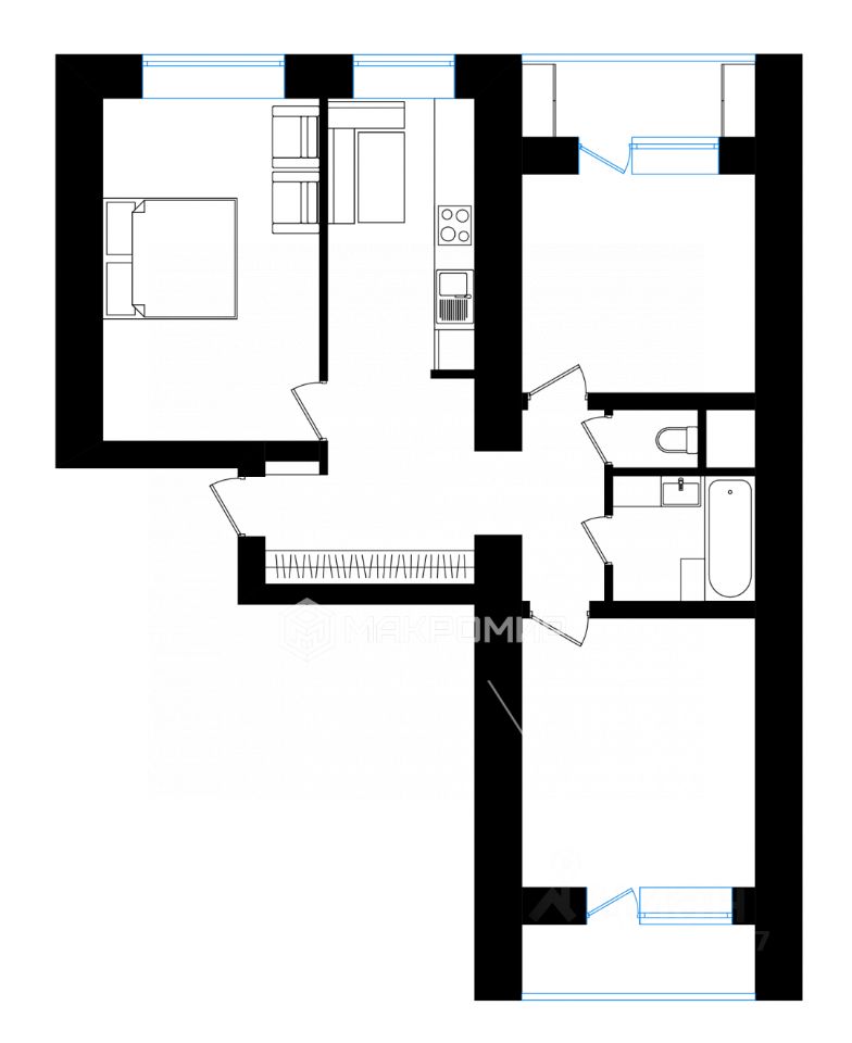 Идеально подходит для семьи: удобно для детей и пожилых родственников. У каждого — своё личное пространство, так как все три комнаты изолированы и не смежные между собой (разделены кухней и санузлами).