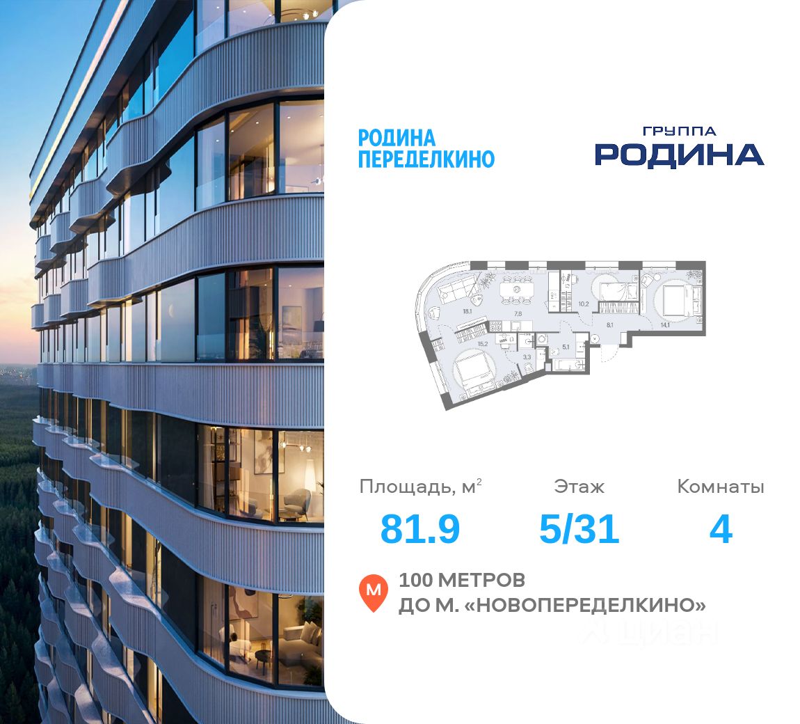 Продаётся 4-комнатная квартира площадью 81.9 м² на 5 этаже в Жилом Комплексе "Родина Переделкино".
