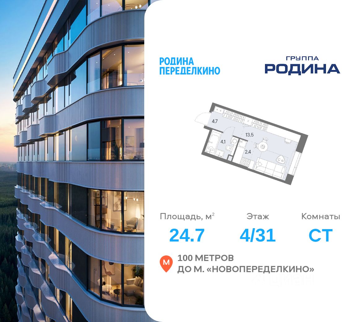 Продаётся студия площадью 24.7 м² на 4 этаже в Жилом Комплексе "Родина Переделкино".