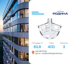 Продаётся 3-комнатная квартира площадью 63.8 м² на 4 этаже в Жилом Комплексе "Родина Переделкино".