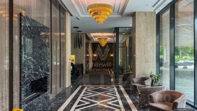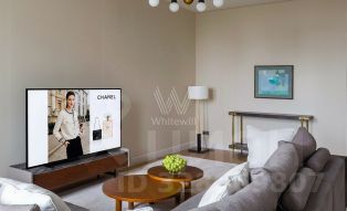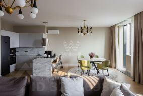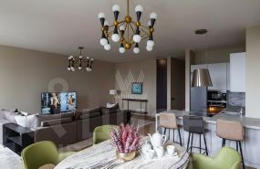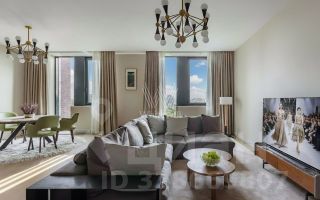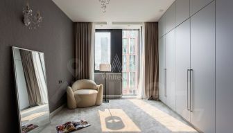 Квартира укомплектована мебелью и бытовой техникой. Функциональная планировка включает просторную кухню-гостиную с обеденной зоной, мастер-спальню со своей ванной комнатой, вторую спальню, три санузла, гардеробную и холл. Окна ориентированы на две стороны, открываются виды на природный заказник Долина реки Сетунь, башни "Москва-Сити", МГУ и на Парк Победы.