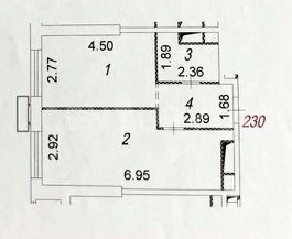Планировка включает в себя: спальню, большую кухню-гостиную, совмещенный санузел.