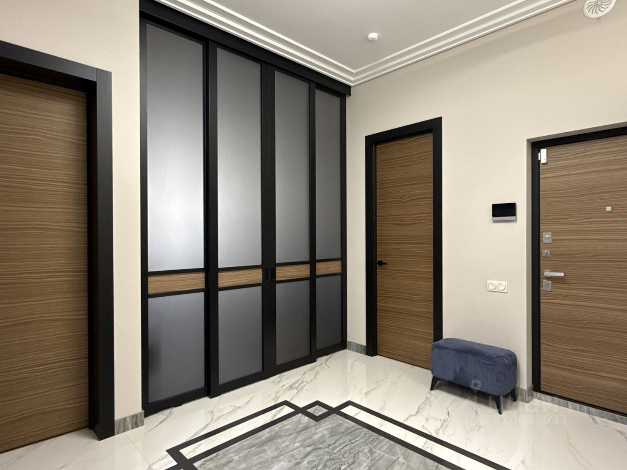 В подъезде два скоростных лифта, светлое лобби с красивыми диванами, кодовая автоматическая дверь с Face IID.