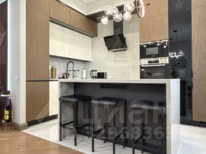 На кухне удобный барный остров с винным шкафом.