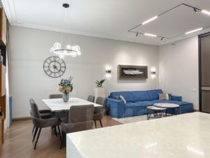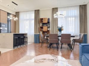 В квартире просторный холл - прихожая, три изолированных спальни (одна из них мастер-спальня), три санузла, светлая кухня - столовая - гостиная, а также постирочная и гардеробная.