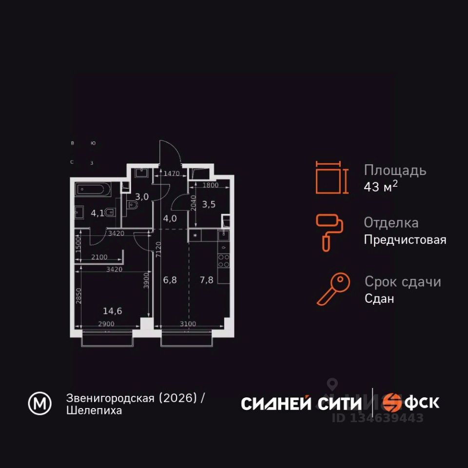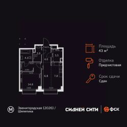 Продаётся 1-к квартира номер 383 общей площадью 43.8 кв.м. на 10-м этаже 43 этажного здания. Предчистовая отделка. Цена с учётом скидки.