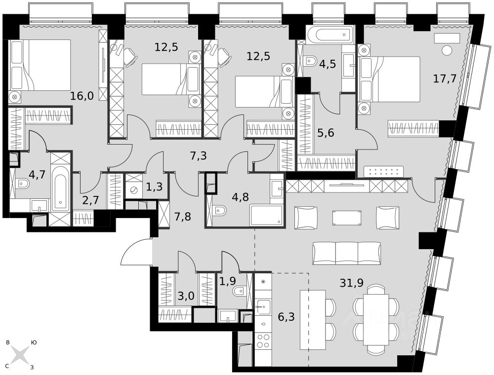 - Мастер-зона с санузлом и гардеробной. Всё для вашего комфорта и удобства, включая личный санузел и гардероб.
