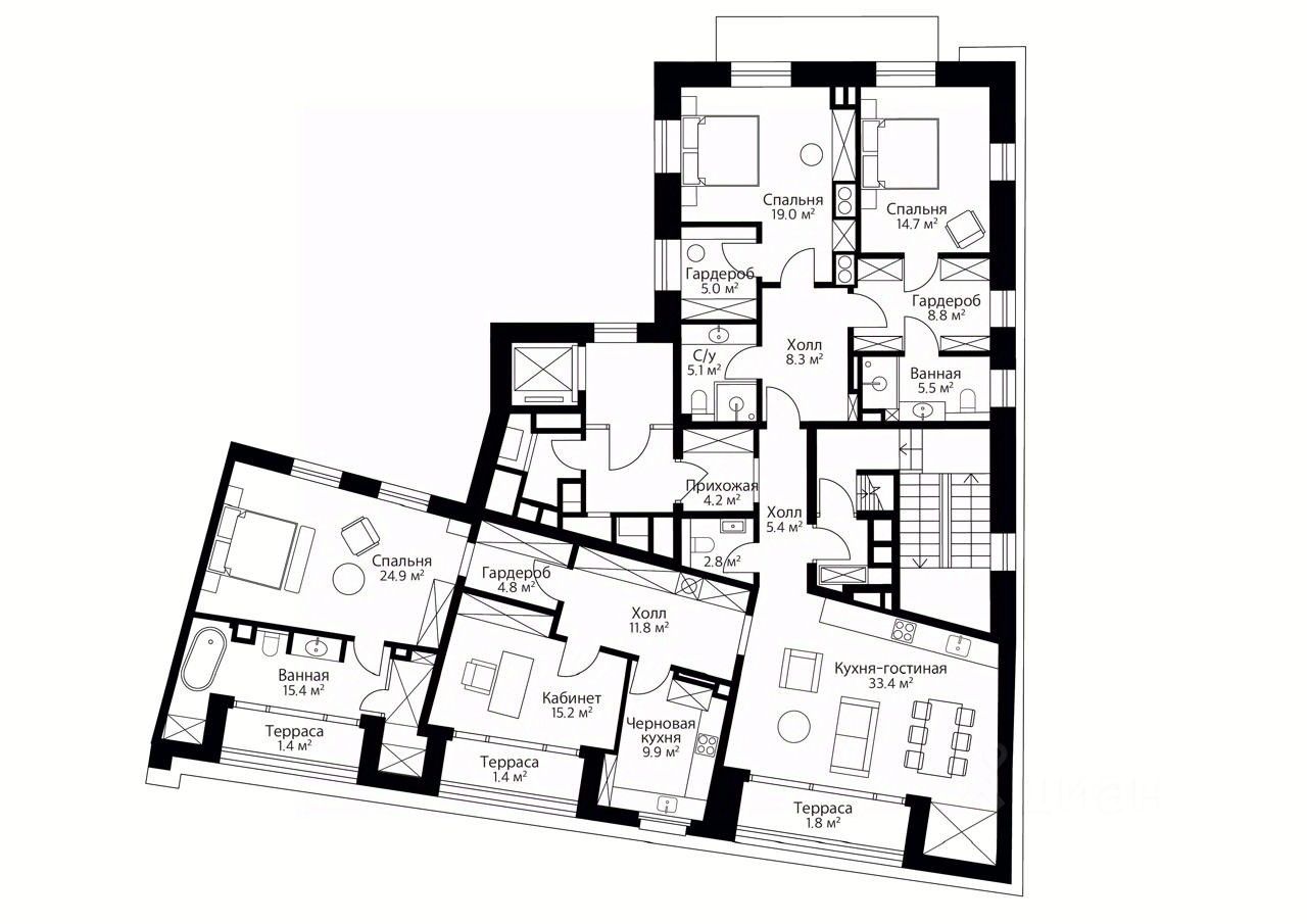 три изолированные спальни, кабинет с террасой, 3 санузла и 3 гардеробные. А отсутствие отделки дает возможность реализовать любые идеи.