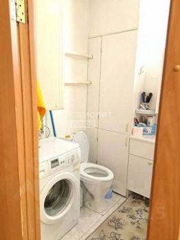 Совмещённый санузел с современной сантехникой и стиральной машиной. Потолки 2,74 м — светло и просторно.