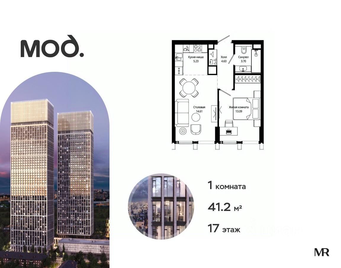 Продается 1-комнатная квартира общей площадью 41.20 м² с предчистовой отделкой в ЖК премиум-класса Мод на 17-м этаже 44 этажного дома.