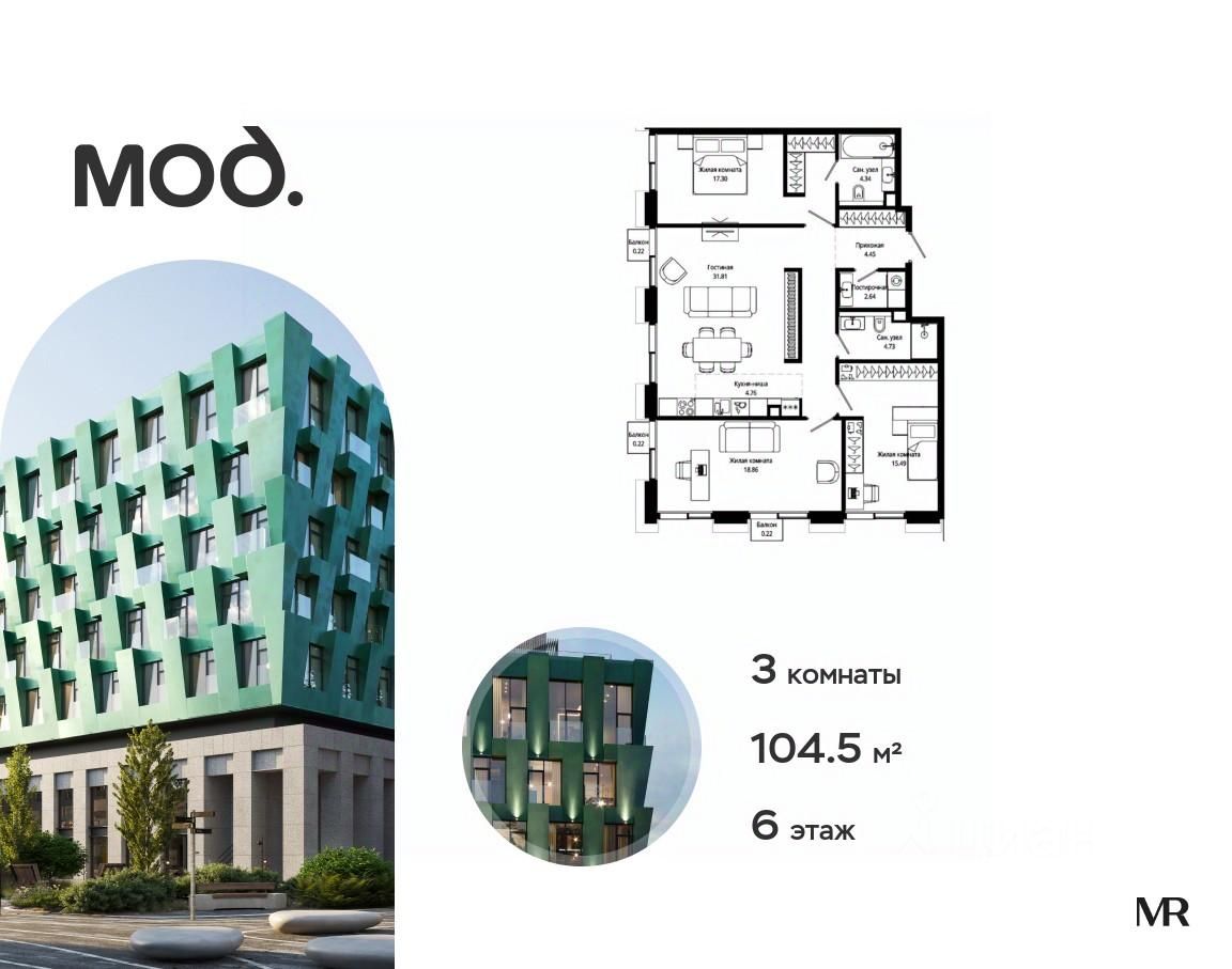 Продается 3-комнатная квартира площадью 104.50 м² с предчистовой отделкой в ЖК Мод на 6-м этаже 7 этажного дома.