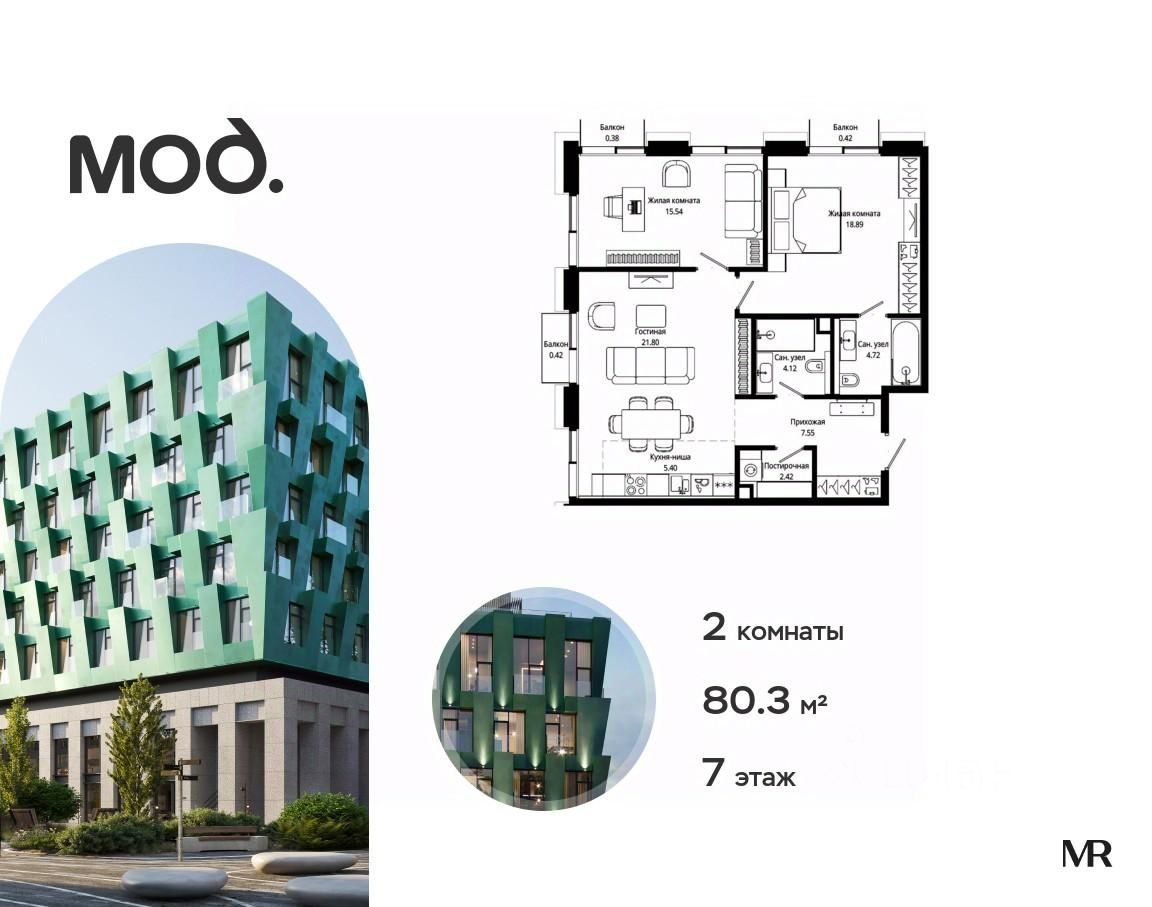 Продается 2-комнатная квартира площадью 80.30 м² с предчистовой отделкой в ЖК Мод на 7-м этаже 7 этажного дома.