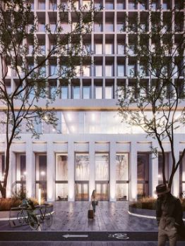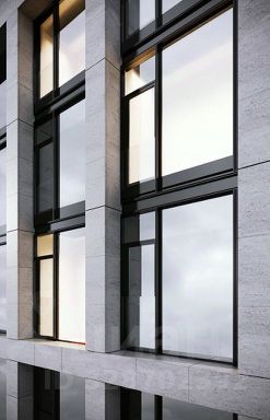 Девятиэтажные корпуса с фасадами из натурального камня на уровне первого этажа. Выше — панели из натуральных меди и латуни, которые со временем окисляются и меняют